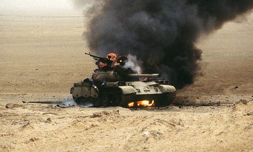 Một xe tăng của quân đội Iraq trúng đạn bốc cháy. Ảnh: Wikipedia