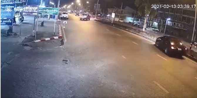 Đang chạy tốc độ cao, dường như tài xế giật mình vì một xe vòng ngang đường nên mất lái, đâm thẳng vò cột điện hôm 13/2 ở Chanthaburi, Thái Lan.