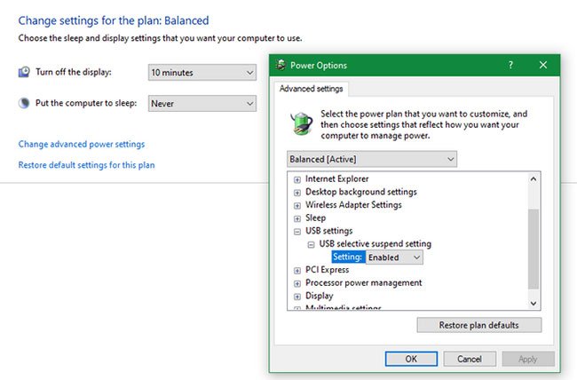 Trên trang Control Panel kết quả, nhấp vào Change plan settings ở bên phải plan hiện tại của bạn. Sau đó, chọn Change advanced power settings để mở một cửa sổ với nhiều tùy chọn hơn. Trong cửa sổ đó, hãy mở rộng USB settings, sau đó chọn USB selective suspend setting. Thay đổi menu drop-down này thành Disabled và nhấn OK.