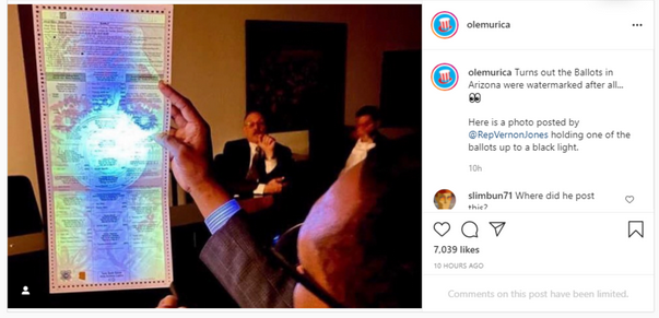 Turns out the Ballots in Arizona were watermarked after all...👀 Here is a photo posted by @repVernonJones holding one of the ballots up to a black light.