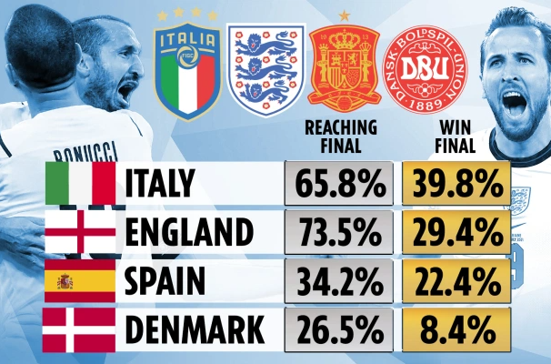 Trước 2 trận bán kết, siêu máy tính của trang Analyst đã đưa ra dự đoán cơ hội giành chiến thắng ở vòng 4 đội mạnh nhất cũng như trận chung kết của Italia, Anh, Tây Ban Nha và Đan Mạch. Theo đó, 2 đội sáng cửa giành vé lọt vào trận chung kết là Italia và Anh.