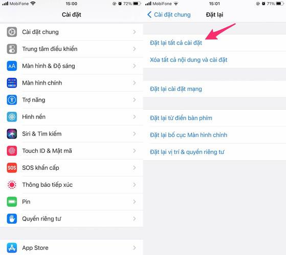 Để thực hiện, bạn hãy vào Settings (cài đặt) - General (cài đặt chung) - Reset (đặt lại) - Reset all settings (đặt lại tất cả cài đặt) và làm theo các bước hướng dẫn cho đến khi hoàn tất. Lưu ý, việc này sẽ không ảnh hưởng đến dữ liệu hiện có.