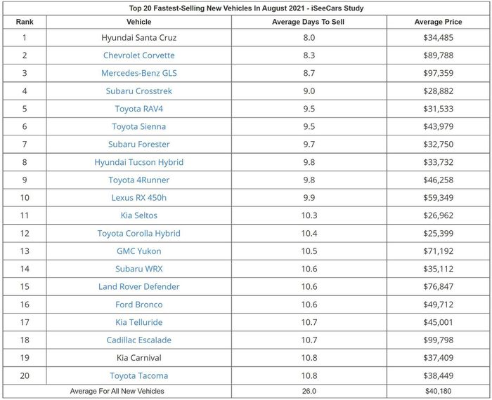 Sau vài tháng kể từ lần ra mắt vào tháng 4, bán tải đầu tiên của Hyundai là Santa Cruz trở thành ô tô bán nhanh nhất tại Mỹ. C8 Chevy Corvette là một trong những chiếc xe được mong đợi nhất trong vài năm qua, và nhu cầu của thị trường cao đến mức khiến nó trở thành ô tô bán chạy nhất tại Mỹ. Tuy nhiên, bán tải Hyundai Santa Cruz nhanh chóng soán ngôi của thương hiệu nội địa theo báo cáo mới đây.