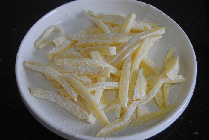 3. Khoai tây chiên phải được tráng một lớp tinh bột trước khi nấu, tinh bột sẽ nhanh chóng bị hồ hóa khi đun với dầu giúp bề mặt khoai tây chiên giòn và ngon.