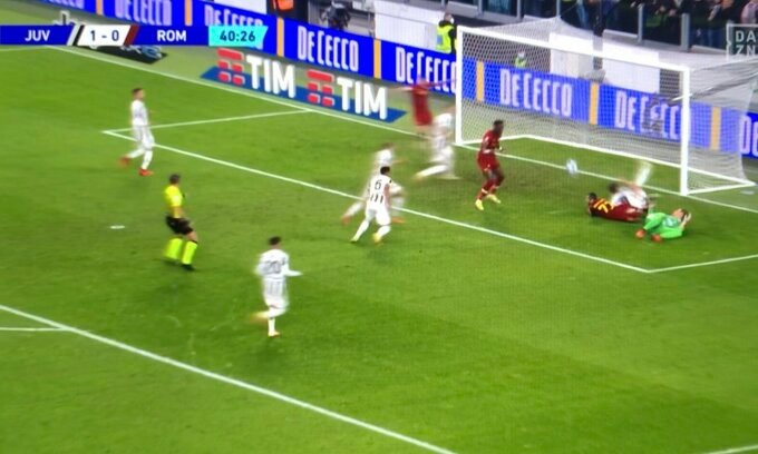 Phút 41, khi Juventus dẫn 1-0, trung vệ Giorgio Chiellini mất bóng trên phần sân nhà, tạo cơ hội cho Roma phản công. Tiền đạo Tammy Abraham dốc thẳng vào cấm địa rồi ngã xuống sau pha truy cản của Danilo. Khi bóng tới chân, Henrikh Mkhitaryan đã tâng qua Wojciech Szczesny, rồi ngã xuống vì vấp vào đùi thủ môn của Juventus. Bóng lăn trở lại trước cầu môn trống, và Abraham dễ dàng đệm vào lưới trống.