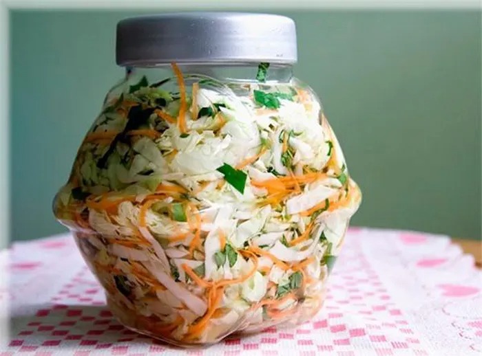 Cho bắp cải và các loại rau củ vào bình sạch, đổ nước muối đường vào, dùng phên cài để cho rau luôn ở dưới mực nước.