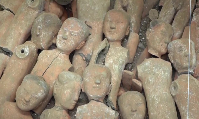 Rất nhiều pho tượng bằng gốm cùng nhiều món đồ tạo tác được tìm thấy trong lăng mộ (Ảnh: Global Times).