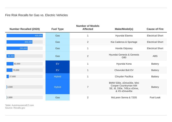 Trong cùng năm, Hyundai Kona EV và Chevrolet Bolt EV là các mẫu xe điện sở hữu hai vụ triệu hồi liên quan đến cháy xe với tổng cộng 152.000 chiếc trong khi hai vụ lớn nhất của xe Hybrid có số lượng tổng cộng hơn 32.000 chiếc.
