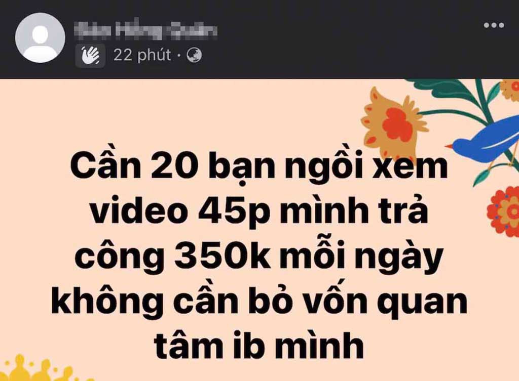 Nhóm “Việc làm online” có hơn 500.000 thành viên, mỗi ngày có đến 2.900 bài viết đăng tin tìm việc làm và tuyển dụng. “Tại đây chỉ tuyển việc nhẹ lương cao, không bằng cấp cùng với mức lương hấp dẫn dao động từ 10 triệu đồng - 20 triệu đồng/tháng dễ dàng thu hút nhiều người muốn thử sức”, theo lời rao trên nhóm này.