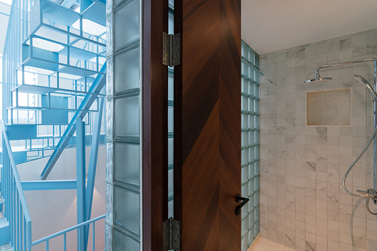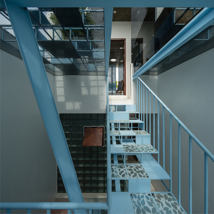 Giếng trời bên trên cầu thang lỗ sắt giúp mọi không gian trong nhà luôn tràn ngập ánh sáng vào ban ngày.