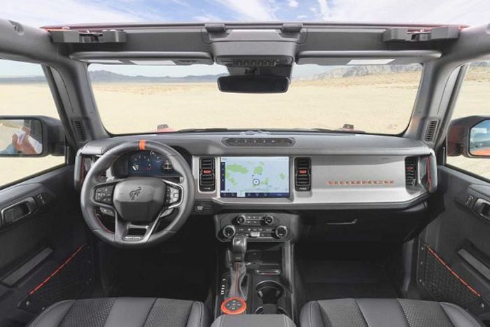 Các thay đổi trực quan trên Bronco Raptor bao gồm bộ mâm 17 inch đi kèm lốp địa hình BFGoodrich K02, vòm bánh mở rộng sơn đen, nắp capo và lưới tản nhiệt Raptor, cản trước Ford Performance tích hợp tời kéo, phối màu cam sáng nổi bật, cụm công cụ kỹ thuật số 12 inch với giao diện Raptor, ghế ngồi Ford Performance,...