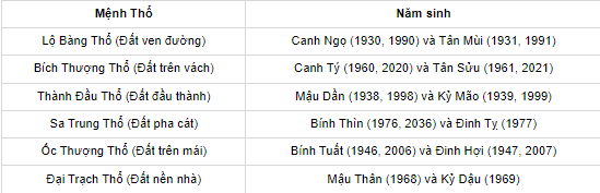 Thổ tượng trưng cho đất, là môi trường sống của nhiều loài sinh vật khác nhau, đất là cội nguồn của sự sống, mang lại sự bình an. Theo ngũ hành thì mệnh Thổ bao gồm 6 nạp âm với các ý nghĩa và tính cách khác nhau. Cụ thể: