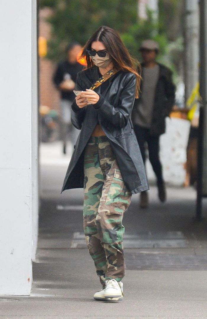 Emily Ratajkowski cũng là tín đồ của cargo pants. Cô thường phối cùng áo crop top để thể hiện nét khỏe khoắn, đồng thời tôn vòng eo. Ảnh: Vogue, Popsugar.