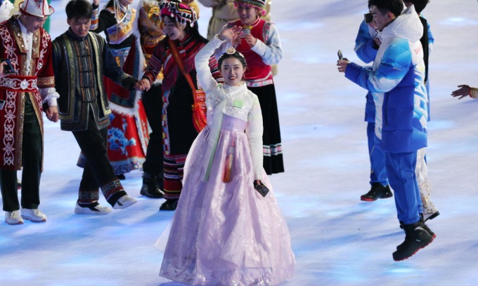 Cô gái mặc trang phục giống hanbok trong lễ khai mạc Olympic Mùa đông Bắc Kinh hôm 4/2. Ảnh:Yonhap.