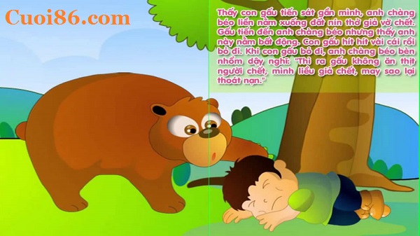 Con gấu lại gần và ngửi vào mặt anh ta, nhưng anh ta cố nín thở giả vờ chết. Con gấu ngửi mãi nhưng thấy anh ta như chết rồi nên nó bỏ đi, k làm hại anh ta.