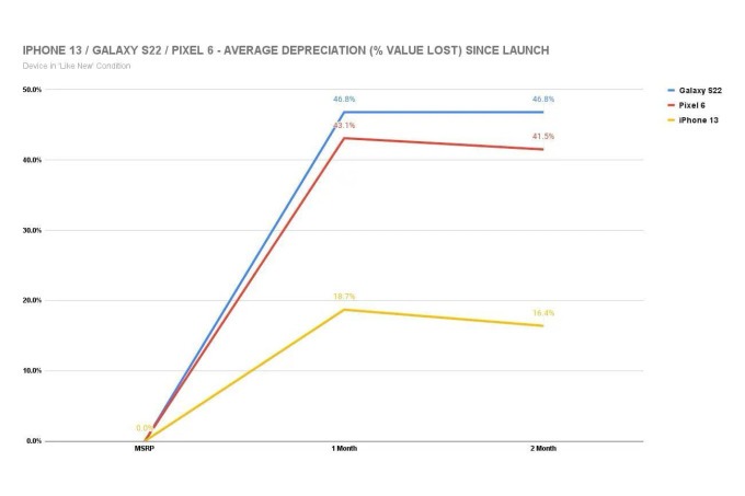 SellCell thu thập dữ liệu trong hai tháng kể từ khi bán ra của mỗi thiết bị và nhận thấy Galaxy S22 là model kém nhất trong việc giữ giá. Một máy S22 hàng gần như mới (like new) mất 46,8% so với giá trị ban đầu, tiếp theo là Pixel 6, mất 41,8% giá trị sau hai tháng ra mắt. Ngược lại, iPhone 13 mất giá 18,7% sau một tháng ra mắt và 16,4% sau hai tháng.