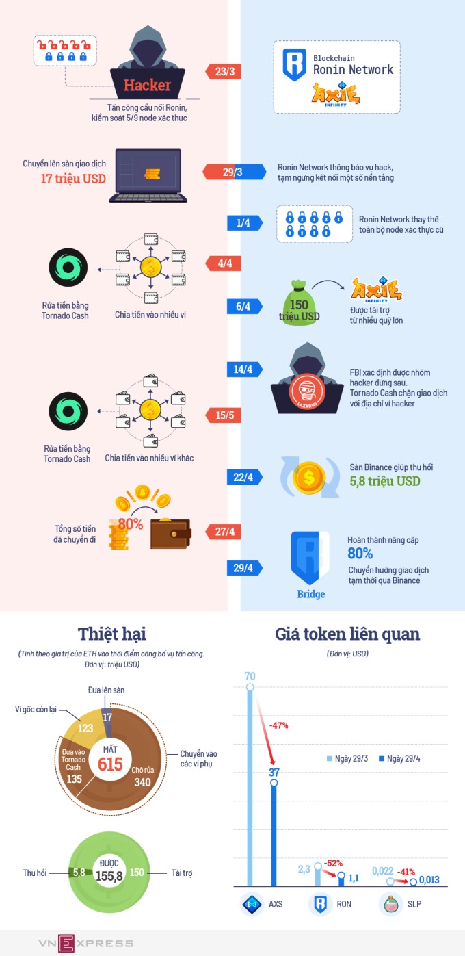 Thông báo được đưa ra tròn ba tháng sau khi vụ hack xảy ra. Hồi cuối tháng 3, tin tặc tấn công vào cầu nối Ronin - nơi chuyển tài sản giữa blockchain Ronin và mạng Ethereum để sử dụng cho game Axie Infinity, từ đó đánh cắp 173.600 ETH và 25,5 triệu USDC. Lượng tiền số này khi đó có giá trị tương đương 615 triệu USD, nhưng nay chỉ còn hơn 200 triệu USD, do sự đi xuống của thị trường tiền số nói chung.