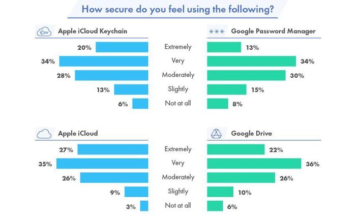 20% người dùng iCloud Keychain cảm thấy cực kì an toàn, trong khi chỉ 13% người dùng trình quản lý mật khẩu của Google cảm thấy như vậy. Tương tự, 27% người dùng cảm thấy iCloud an toàn trong khi chỉ có 22% người dùng Google Drive cảm nhận tương tự.