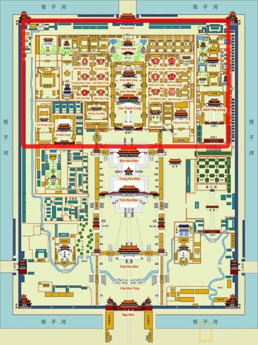 Sơ đồ Tử Cấm Thành Bắc Kinh ngày nay. Trục trung tâm thẳng hướng với Ngọ Môn là các điện Thái Hoà, Trung Hoà, Bảo Hoà và hai cung Càn Thanh, Khôn Ninh.