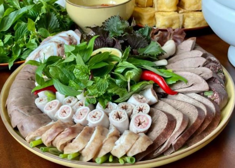 Lòng lợn kèm rau húng, chấm nước mắm cốt pha gừng, ớt, chanh. Miếng lòng trắng, giòn rụm, thơm ngon. Ảnh minh họa
