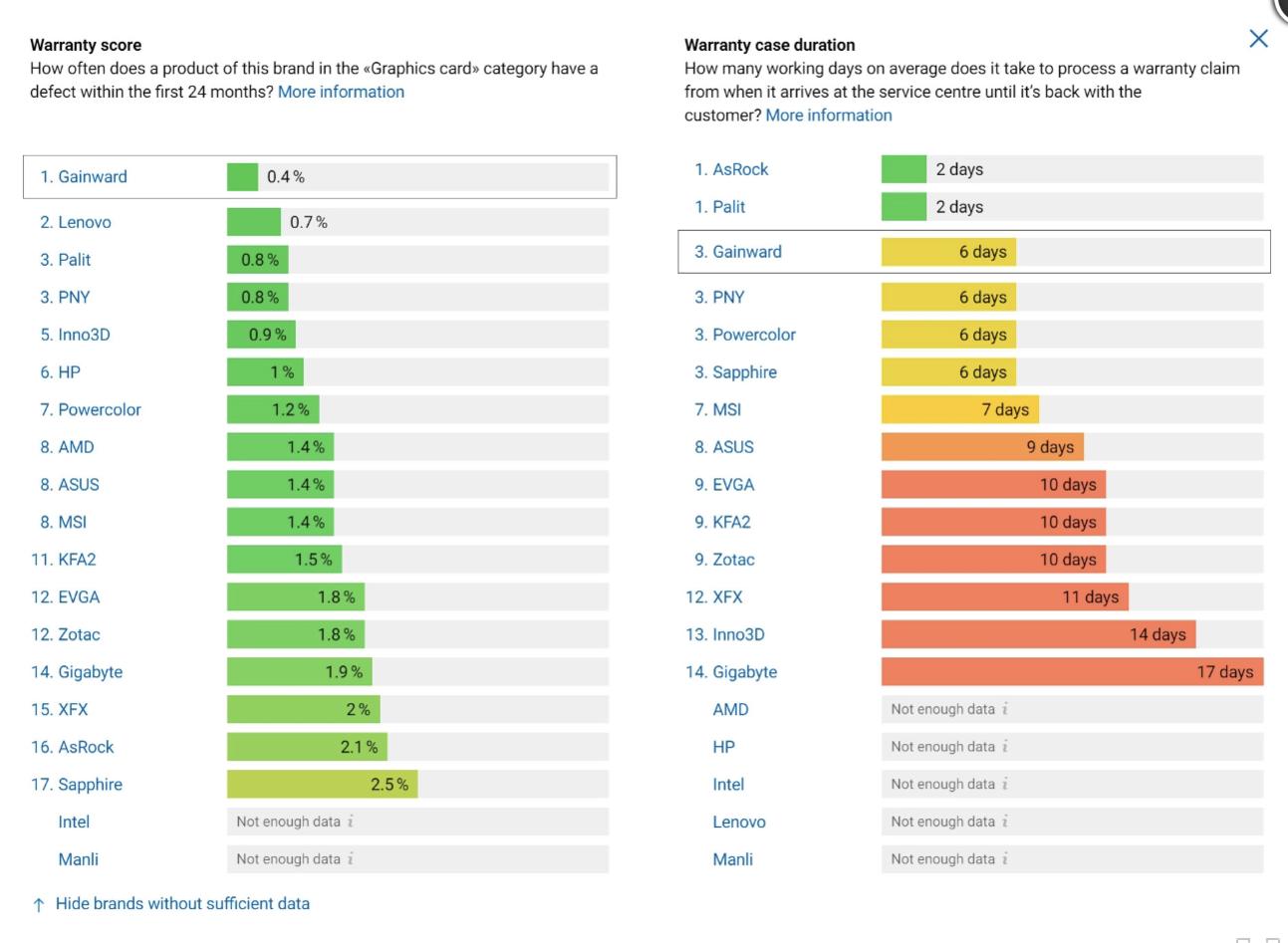 Các biểu đồ cho thấy thương hiệu Gainward có số lượng card đồ họa bị lỗi thấp nhất, với tỷ lệ RMA (trả lại hàng ủy quyền) là 0,4%. Gainward, thuộc về Palit từ năm 2005, hầu như không được biết đến khá nhiều bên ngoài thị trường châu Âu. Trong khi đó, Palit đứng ở vị trí thứ 3 trên bảng xếp hạng. Trên tổng số 100% card đồ họa được Palit bán ra tới tay người dùng, 0,8% trong số này bị lỗi và phải bảo hành.