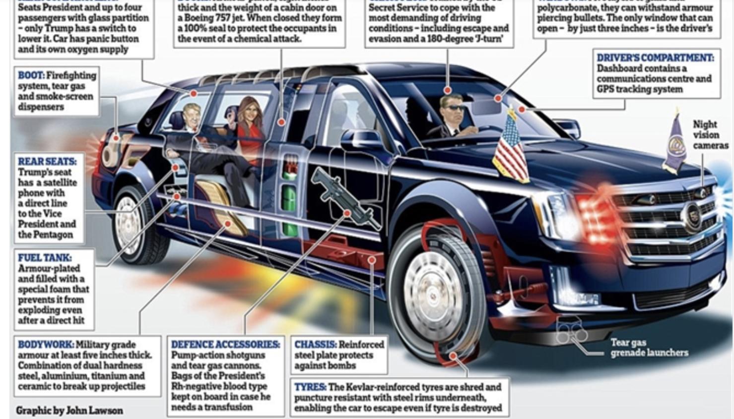Cửa xe cũng được gia cố giống như cửa máy bay hạng nặng, và kính chống đạn có độ dày 127mm. Lốp xe dày 200mm, tương đương với loại lốp dành cho xe bus, cho phép chiếc xe tiếp tục di chuyển ngay cả khi bị bắn hoặc phá hủy bởi vụ nổ.