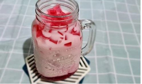 - Đổ sữa tươi vào, thêm màu thạch hồng là đã có ly đồ uống đẹp mắt như ngoài hàng.