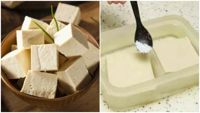 Chuẩn bị một bát nước nóng, thêm một thìa cà phê muối vào khuấy đều. Khi muối tan thì thả các miếng đậu vào ngâm trong nước ngày khoảng 30 phút.