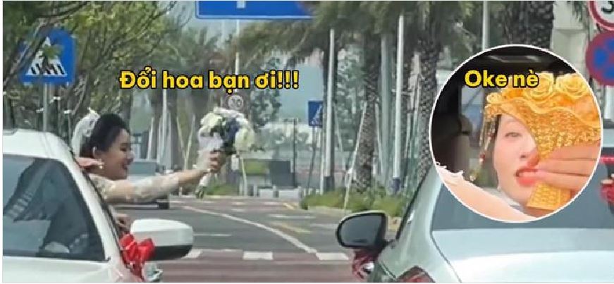Theo video, hai chiếc xe hoa bất ngờ gặp nhau trên đường đi. Hai cô dâu hớn hở hạ kính xe để thực hiện nghi thức đổi hoa cưới truyền thống.