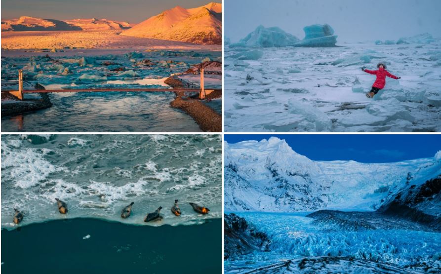 Dưới ánh mặt trời, những tảng băng lấp lánh như những viên ngọc tuyệt đẹp, xa xa là khung cảnh những núi tuyết trắng xóa trên nền trời ửng hồng đẹp tựa bức tranh. Men theo lối đi bộ đường dài, chúng tôi nh́n ngắm khung cảnh rộng lớn, huyền ảo cùng những chú hải cẩu đáng yêu đang lăn lộn trên băng.
