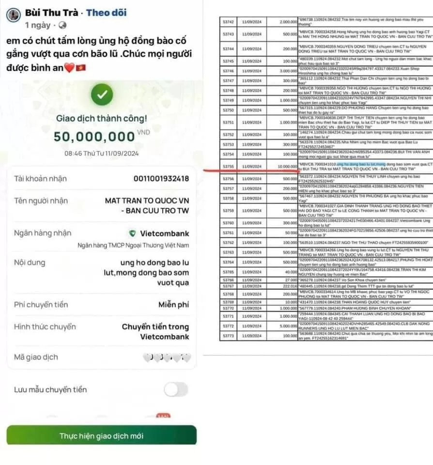Tuy nhiên, hôm qua, cộng đồng mạng được phen dậy sóng khi phát hiện tại sao kê của Mặt trận Tổ quốc Việt Nam có một nội dung thông tin chuyển khoản hoàn toàn trùng khớp với Bùi Thu Trà đã chia sẻ với nội dung “ung ho dong bao lu lut, mong dong bao som vuot qua” từ Bui Thu Tra (thứ tự 53754 chuyển tiền ngày 11/9/2024). Nhưng chỉ khác, số tiền thực tế là 10 triệu đồng thay vì 50 triệu đồng như cô gái trẻ đã chụp bill trước đó.