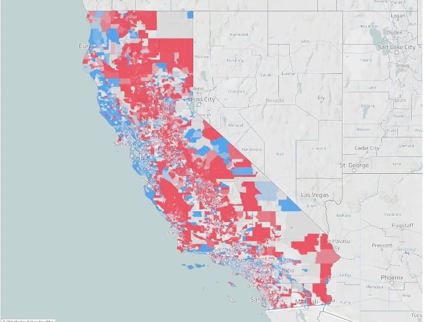 Nếu bỏ phiếu bằng cách đến phòng phiếu và xét căn cước thì California năm nay cũng có thể trở thành Cộng hoà như thời ông Reagan. Xem bản đồ ghi danh bỏ phiếu năm nay.
