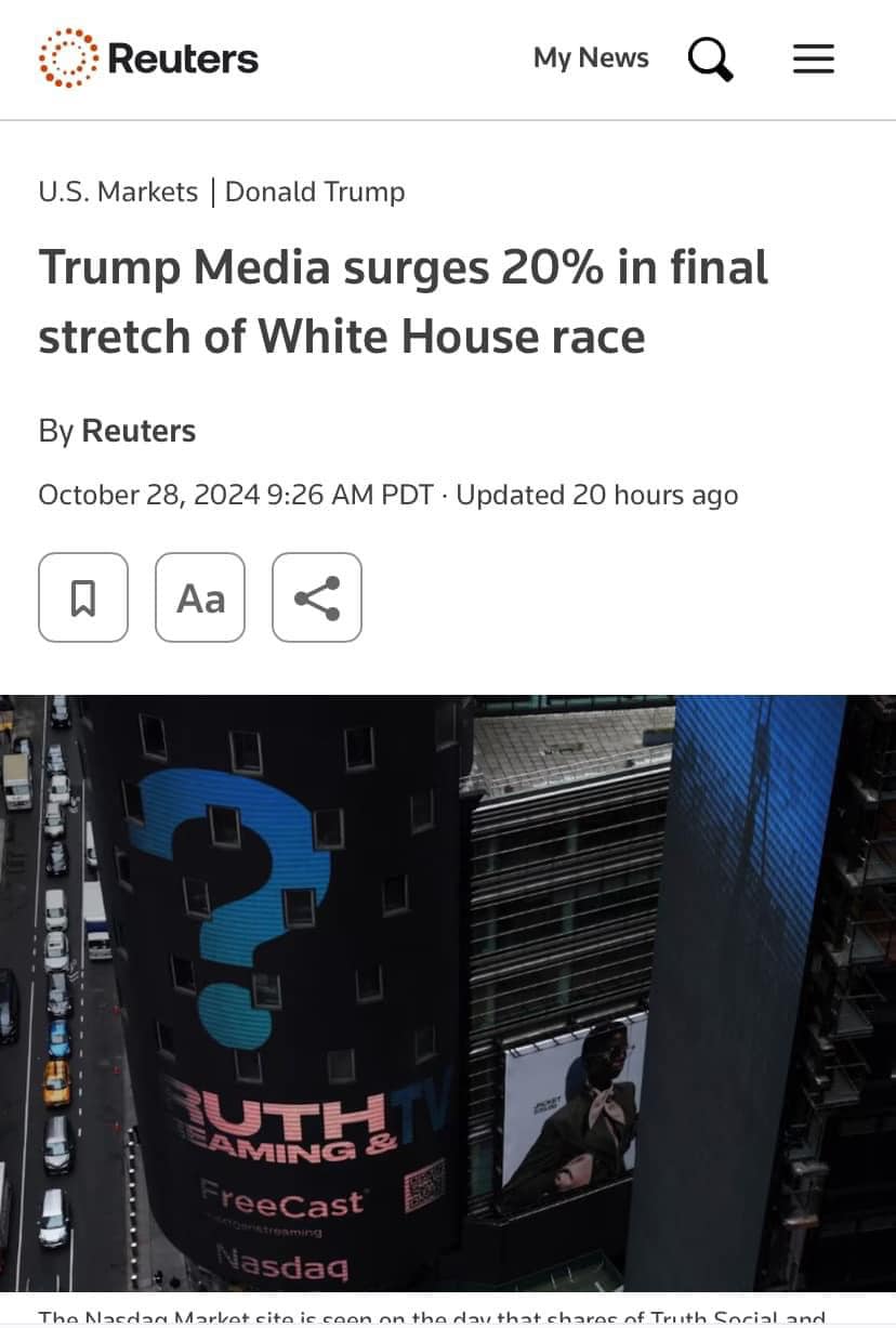 Trước khi Elon vận động cho ông Trump giá DJT chỉ có $11.75. Từ ngày Elon chính thức nhập cuộc đến nay DJT đã lên đến 500%, một con số không tưởng trong vòng 1 tháng.