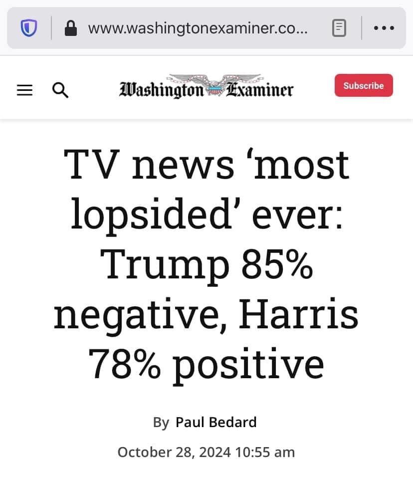 Truyền hình tin tức đã đạt mức thiên vị tột đỉnh. 78% nói tốt cho Kamala 85% nói xấu Trump.