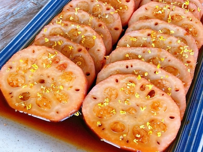 Bước 5: Sau khi củ sen đã ngấm gia vị, hãy vớt ra, cắt thành những miếng vừa ăn và trình bày trên đĩa. Phết một ít nước sốt lên trên và bạn đã sẵn sàng để thưởng thức. Món củ sen nhồi gạo nếp với đường đen khi hoàn thành cũng có thể dùng lạnh rất ngon.