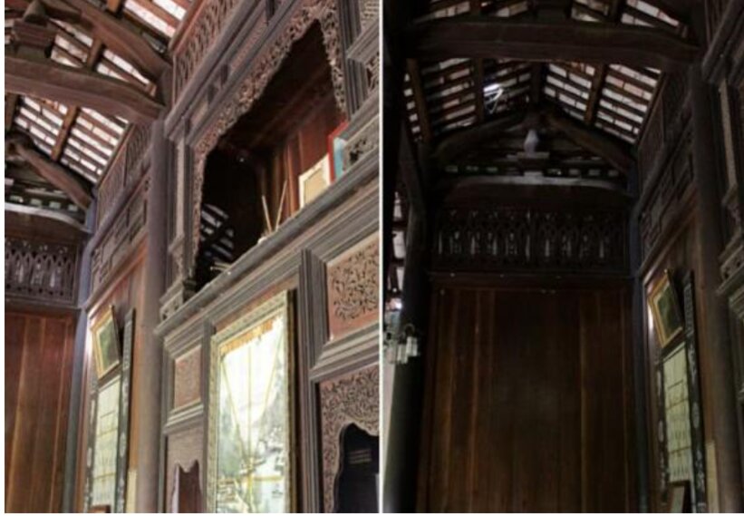Điều đặc biệt là ngôi nhà không hề sử dụng một chiếc đinh nào mà dựng lên với phương pháp ghép mộng để kết nối hệ thống kèo cột, vách gỗ… Các v́ kèo cũng được chạm khắc h́nh linh vật, họa tiết mềm mại, đẹp mắt.