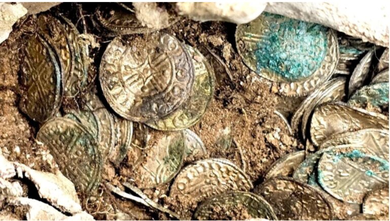 Cận cảnh những đồng tiền bên trong kho báu vừa được khai quật ở Anh - Ảnh: OCA