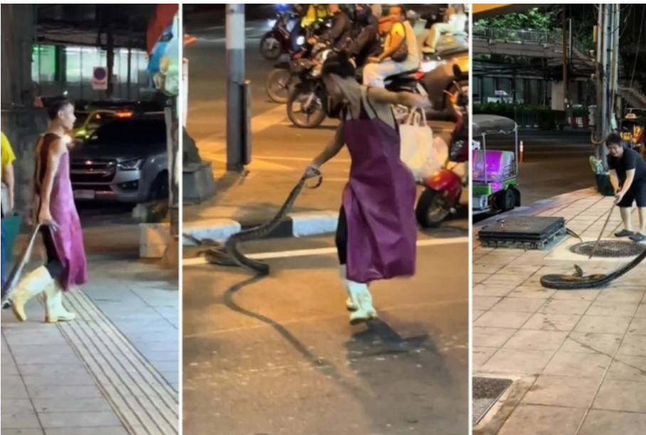 Đoạn clip được chia sẻ trên mạng xă hội cho thấy, một người đàn ông, mặc tạp dề bán hàng đă dũng cảm khống chế một con rắn lớn. Bất chấp việc không có đồ bảo hộ, người đàn ông này nhanh chóng túm đuôi con rắn và kéo nó qua đường, trước sự ngỡ ngàng của những người chứng kiến.