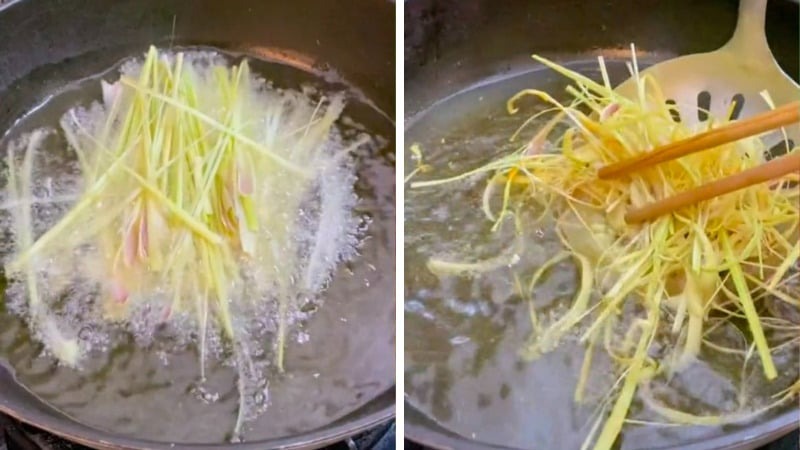 Bắc chảo lên bếp, cho dầu vào ngập 1/3 chảo, đợi sôi thì cho sả sợi vào đảo đến khi vàng thì vớt ra.