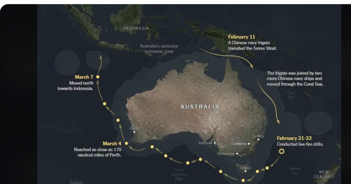 Đội h́nh của Trung Quốc dường như đă đến mà không có thông báo trước dọc theo bờ biển phía đông của Úc, tiến hành tập trận vũ khí ở vùng biển quốc tế giữa Úc và New Zealand, sau đó tiếp tục di chuyển về phía nam Úc trước khi tiến về phía bắc dọc theo bờ biển phía tây.