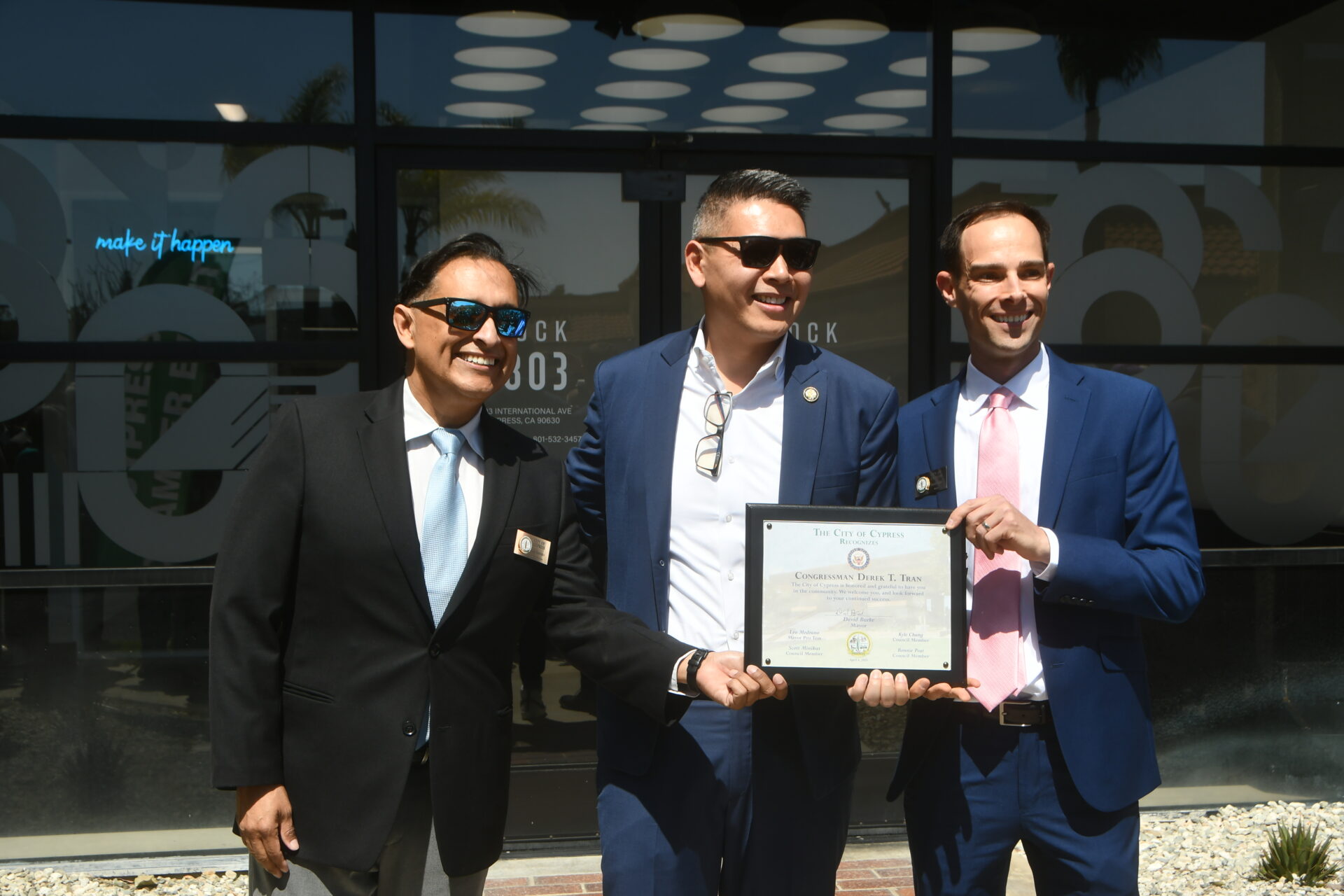 Đông đảo cộng đồng, người ủng hộ và đại diện của nhiều thành phố có mặt tại Cypress để dự lễ khai trương văn phòng địa hạt của Dân Biểu Liên Bang Derek Trần.