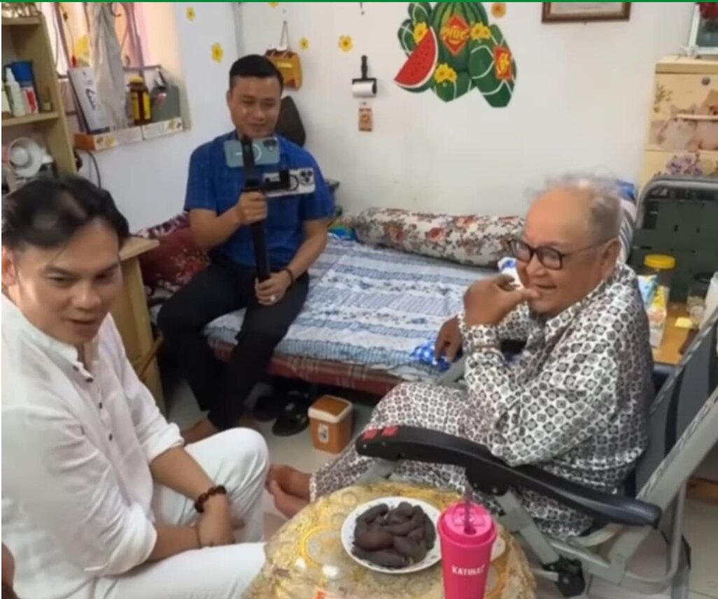 NSƯT Kim Tiểu Long (áo trắng) đến thăm Nghệ sĩ Nhân dân Hùng Minh. Ảnh: Cắt từ clip Kim Tiểu Long.