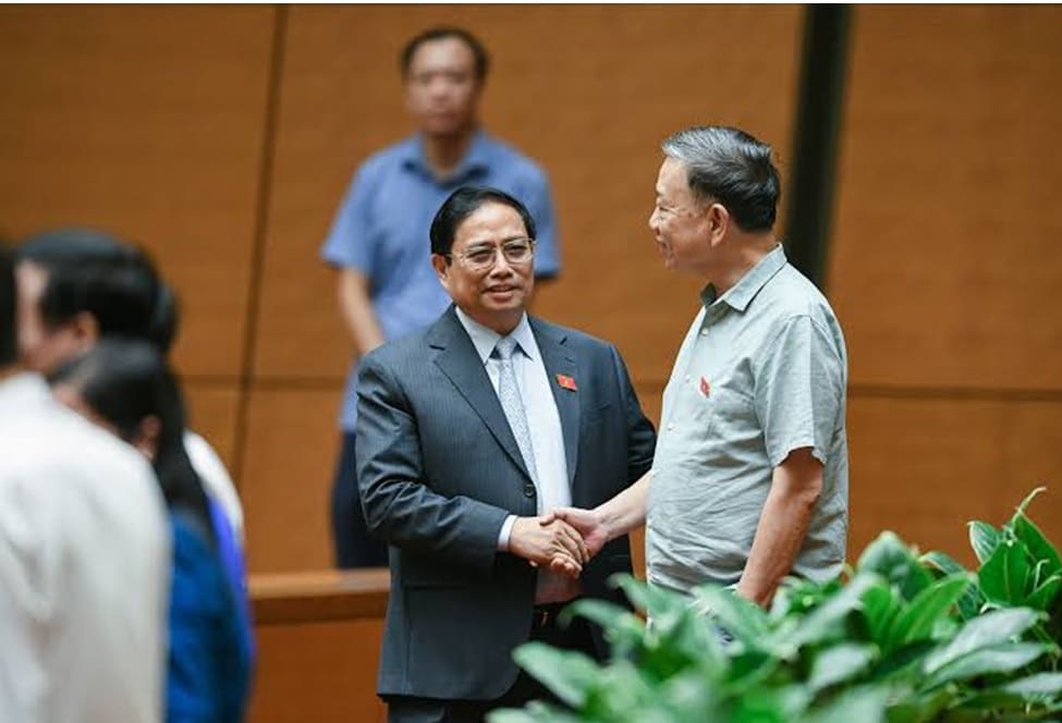 Tô Lâm bắt tay Phạm Minh Chính trong cuộc họp Quốc hội