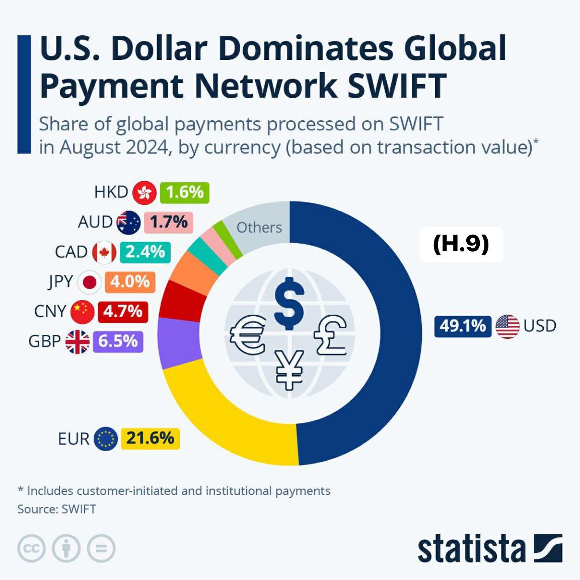e. Không biết ai tư vấn mà ông Trump đe trừng phạt các quốc gia sử dụng đồng tiền của khối BRICS? BRICS chưa nói ǵ về đồng tiền chung, chỉ bàn về hệ thống thanh toán xuyên quốc gia BRICS Bridge bằng các đồng nội tệ (ví dụ NDT, rupi hay ruble) song song bên cạnh SWIFT. Tức nói về hệ thống thanh toán mới chứ không bàn về đồng tiền mới. SWIFT hiện thanh toán rất nhiều loại tiền tệ chứ không chỉ USD hay EUR (trong ngoặc là thị phần thanh toán): USD (49%), EUR (21,6%) c̣n có Bảng Anh GBP (6,5%), Yên Nhật JPY (4%), dollar Canada CAD (2,4%), dollar Úc AUD (1,7%), dollar Hongkong HKD (1,6%) và cả Nhân dân tệ CNY - những gần 5% hơn cả Yên Nhật (H.9). Vụ này rất nhiều người cũng đang nhầm lẫn.