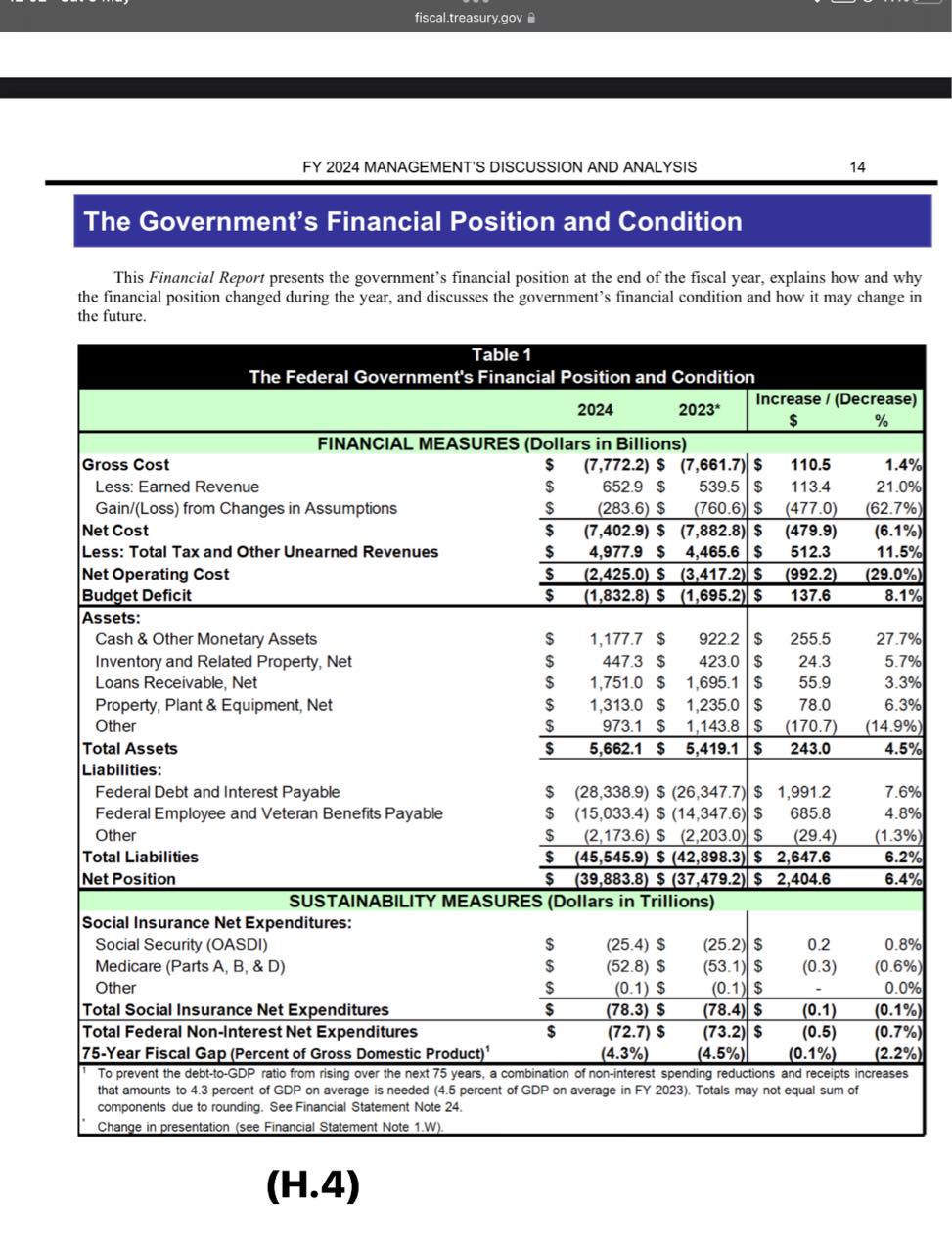 Các năm 2023-2024 nước Mỹ làm ra $27-$29 ngàn tỷ (hiểu GDP theo nghĩa giá trị gia tăng). Thu và phải thu ngân sách lần lượt: $4,5-5,0 ngàn tỷ, phải chi ngân sách: $7,7-$7,8 ngàn tỷ. Chi nhiều hơn thu: $3,4-$2,4 ngàn tỷ (H.4). Thâm hụt ngân sách $1,7-$1,8 ngàn tỷ (thâm hụt ngân sách ít hơn (Thu - Chi) v́ có những khoản phải chi nhưng chưa chi lần lượt là $1.700-$600 tỷ mỗi năm (H.5).