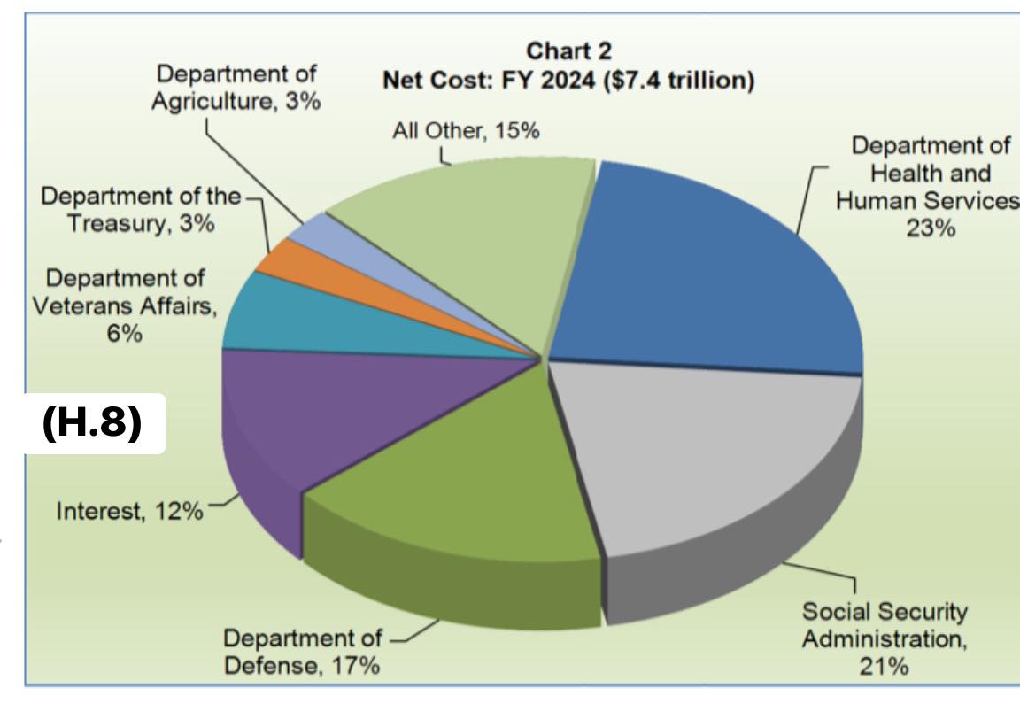 b. Vay nợ nhiều làm tăng chi do trả lăi, tăng thâm hụt ngân sách… càng phải tăng vay nợ. Lượng thành chất và trở thành vấn đề thực sự khi mục chi trả lăi chiếm tỷ trọng quá lớn trong tổng chi chính phủ sẽ ảnh hưởng trực tiếp tới các chương tŕnh quốc gia, đầu tư và an sinh xă hội (H.2). Elon Musk kêu như (H.1) là có lư của nó. Ví dụ năm 2023 chi trả lăi chiếm 13% trong khi chi quốc pḥng chỉ 15% tổng chi (H.7), năm 2024 là 12% và 17% (H. 8): tương đương nhau rồi.