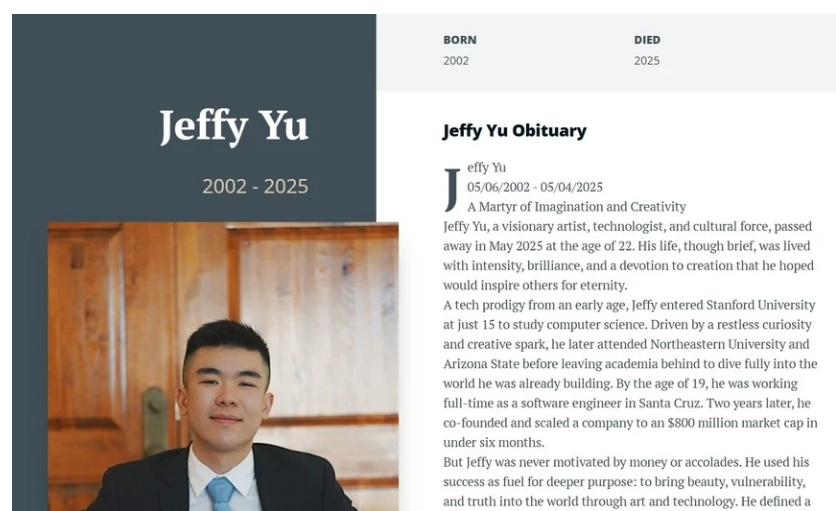 Cáo phó của Jeffy Yu trên Legacy.com, hiện đã bị xoá. Ảnh: @Vee.