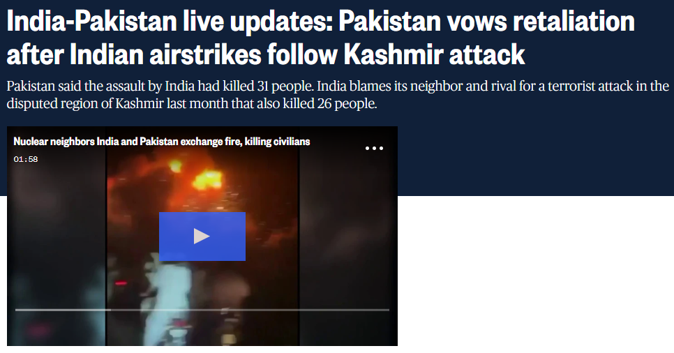 Ấn Độ đã phóng tên lửa vào nước láng giềng và đối thủ Pakistan vào thứ Tư, làm leo thang đáng kể căng thẳng giữa các cường quốc hạt nhân trong những gì Pakistan gọi là "hành động chiến tranh".