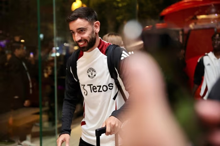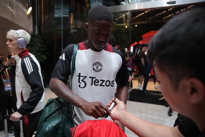 Không khí náo nhiệt, đỏ rực màu áo đấu MU, rộn ràng tiếng hô vang tên các ngôi sao như Bruno Fernandes, Casemiro hay Andre Onana. Đội trưởng Fernandes xuất hiện rạng rỡ, nở nụ cười và thân thiện vẫy tay, ký tặng fan.