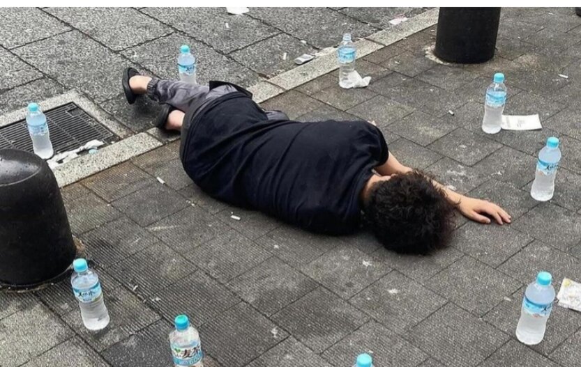 Bức ảnh lan truyền trên X cho thấy một người đàn ông đang nằm ngủ say trên đường, bao quanh anh là hàng chục chai nước được sắp xếp gọn gàng.